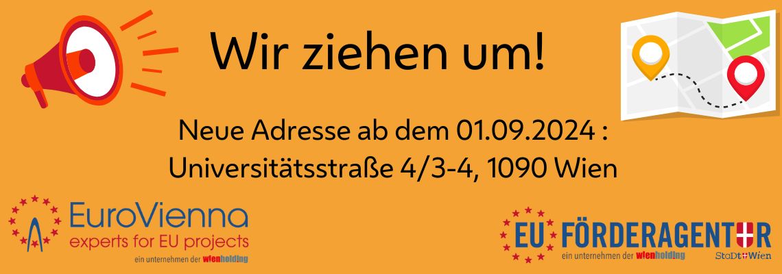 Die EuroVienna und die EU-Förderagentur ziehen im Laufe dieser Woche um und ab dem 1. September 2024 stehen die Unternehmen am neuen Standort in der Universitätsstraße 4/3-4, 1090 Wien, zur Verfügung. EuroVienna und die EU-Förderagentur sind weiterhin unter den bekannten Telefonnummern erreichbar und freuen sich darauf, auch in Zukunft EU-Projekte zu unterstützen.