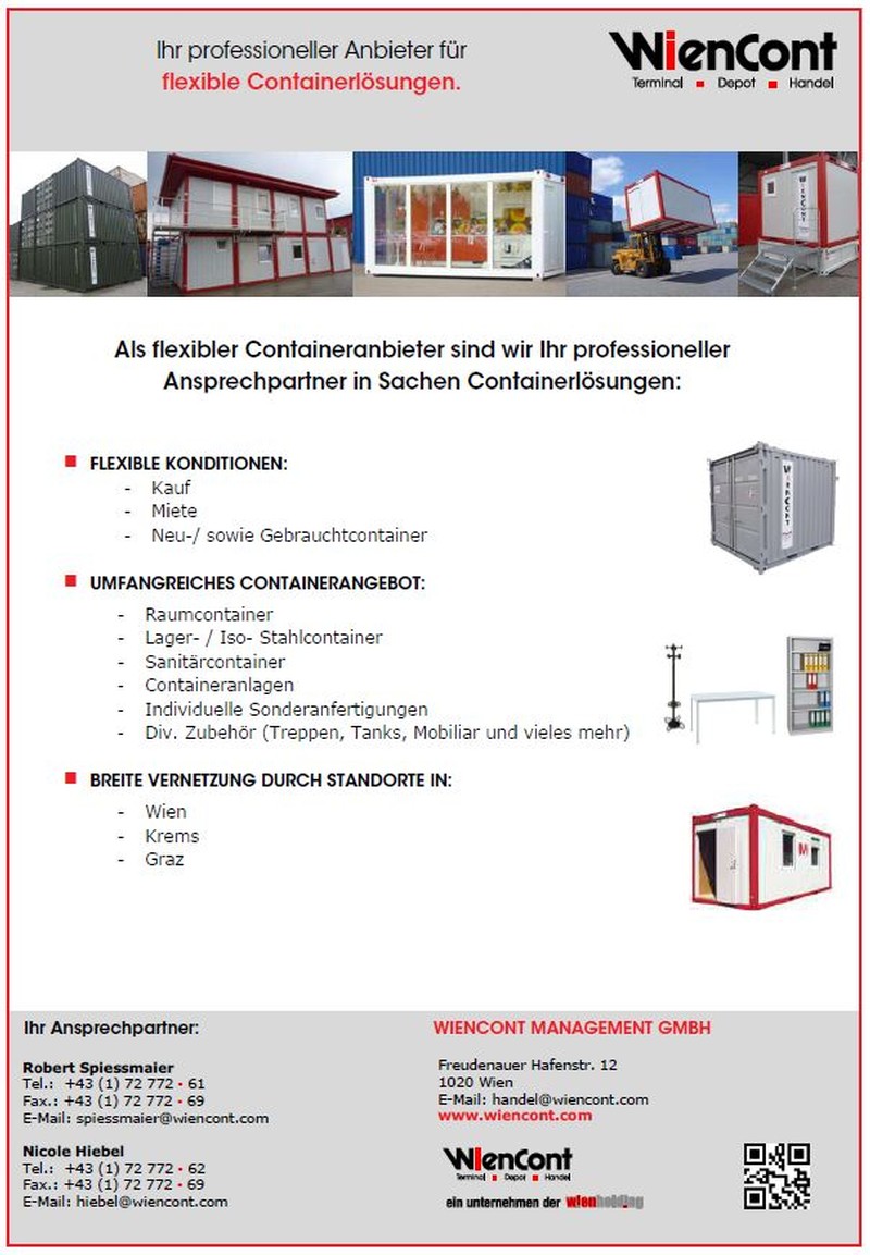 WienCont, Betreiber des Containerterminals am Hafen Wien, der zur Wien Holding gehört, erweitert das Portfolio und bietet nun sonderangefertigte Container - für flexible und mobile Lagermöglichkeiten, Produktpräsentationen oder Ausstellungsmöglichkeiten - an.