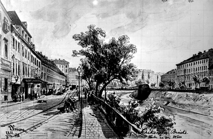 Theater an der Wien mit Wienfluss und Schikanederbrücke 1888 / Alter Stich von Jan Varrone © Votava